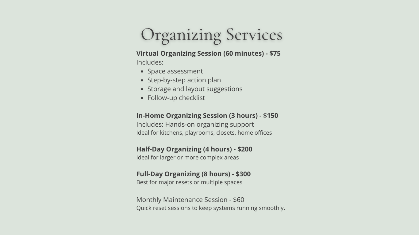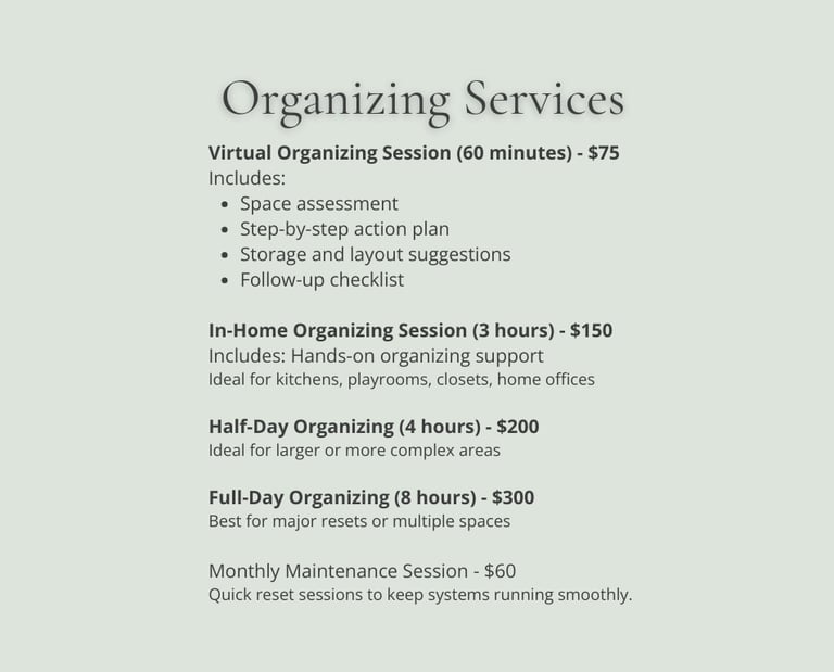 LifeKit Organizing Services focuses on creating simple, sustainable systems - not just pretty spaces. Whether you need help with a single room or ongoing support, we'll create solutions that fit your real routines.
